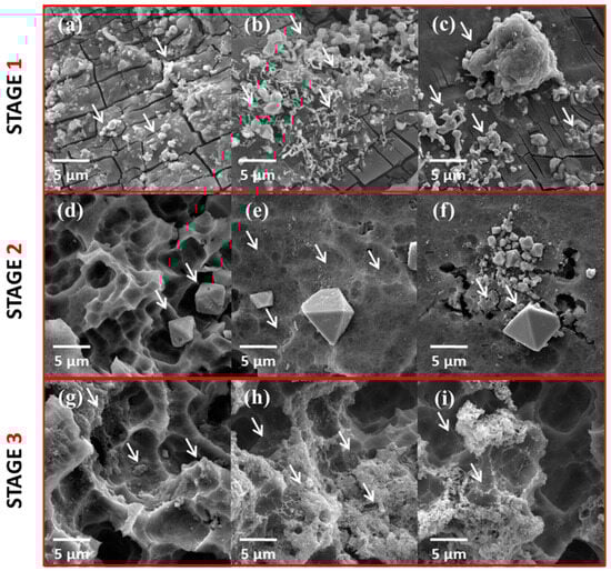 Micrographs of aluminum samples coated with the Cu-MWCNT nanocomposite at different stages of the experiments: (a–c) samples obtained in Stage 1 showing the adhesion of the composite to the aluminum oxide layer at 9.23 k × magnification; (d–f) morphology of the pores created during anodization and the presence of copper crystals in octahedral shape at 9.23 k × magnification; (g–i) high porosity of the region due to the action of the electric field in the formation of the anodic layer, highlighting the high concentration of nanotubes adhered to the region at 9.23 k × magnification.