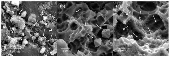 The changes in parameters in the anodization and electrodeposition processes for the Cu-MWCNT coating played an indispensable role in enhancing the surface electrical conductivity of the 3003 aluminum alloy substrates. The high-resolution FEG-SEM images provided a detailed visualization of the anodic layer’s topography, revealing the intricate network of pores formed during the anodization process (Figure 5b,c). As observed, the anodization process, which created a porous alumina layer, and the pulsed electrodeposition technique ensured a homogeneous dispersion of Cu-MWCNTs on the aluminum surface, consistently indicating a uniform coating on the anodized substrate surface, as can be seen in Figure 5b,c, confirming the effectiveness of the pulsed electrodeposition technique after treating the aluminum surface with the formation of the anodic oxide layer. In fact, in Stage 1 (Figure 5a), it was observed that the pores were not effectively created, and that only after increasing the anodization time in the subsequent stages did they occur for a duration of 120 min. In addition, in Figure 5b, it is possible to observe the presence of copper crystals. Similar results can be found in the work of Rodrigues et al. []. In Stage 3 (Figure 5c), a higher concentration of the Cu-MWCNT composite coating the surface and interior of the pores created by the anodization process was observed due to the increase in the MWCNT concentration to a range between 0.9 and 1 mg/mL.