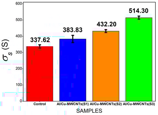 Surface electrical conductivity (S) comparing the control, Al/Cu-MWCNTs(S1), Al/Cu-MWCNTs(S2), and Al/Cu-MWCNTs(S3) samples.