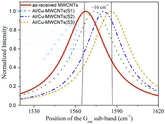 Indeed, a smaller FWHM indicates that vibrations are more concentrated around a specific frequency, while a larger width suggests a broader distribution of vibrational frequencies. Therefore, even if we cannot use the frequencies of the Gin and Gout to monitor the doping level, the observed changes in FWHM and positions (Figure 7) suggest some doping mechanism in the distribution of the outermost nanotubes. Thus, the increases in the FWHM of the Gout and Gin sub-bands observed in Table A1 and Table A2 of Appendix A suggest an intensification of doping effects in the Al/Cu-MWCNTs(S3) samples compared to the as-received MWCNTs and the composites generated in previous stages. This information points to a high density of defects created in this composite [,].