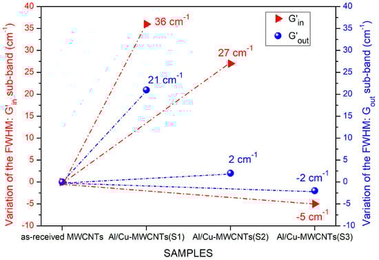 Broadening and narrowing of the FWHM to the outer and inner G’ sub-bands comparing the Al/Cu-MWCNTs(S1), Al/Cu- MWCNTs(S2), and Al/Cu-MWCNTs(S3) samples with the as-received MWCNTs.