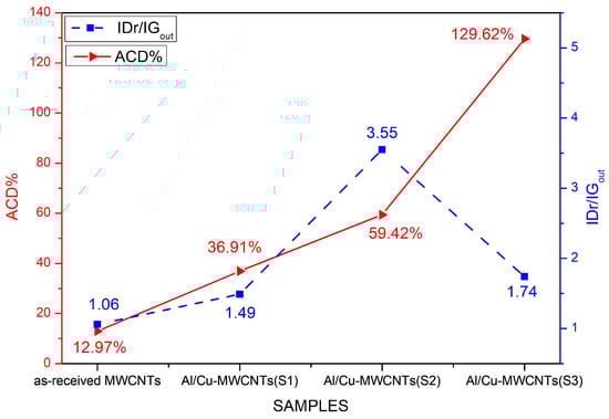 Alternatively, a detailed investigation was conducted at various stages of the electrodeposition process, revealing an increase in the defect density in the outermost nanotubes. This assessment was made based on the IDr/IGout ratio (Figure 9). As observed in Table 2, there was an increase in the amount of amorphous carbon in the Al/Cu-MWCNTs(S3) composite, as revealed by the Dmiddle sub-band. Furthermore, the ratio between the areas of the Dmiddle sub-band and the G band, known as the Amorphous Carbon Degree (ACD), indicates the amount of amorphous carbon in the sample [,] which refers to the sp3 and sp2 bond sites according to equation