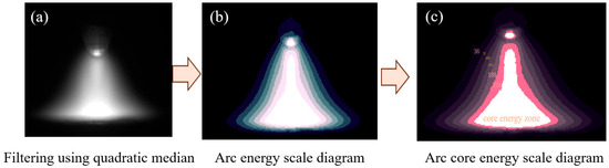 The brightness of the arc plasma reflected the energy of the arc and the brightness value was positively correlated with the arc energy [21]. To better analyze the arc, image processing software was used to process the arc image through several steps to obtain the arc energy diagram, as shown in Figure 4a–c: