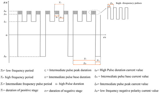 The power supply for the pulsed DP-VPTIG welder was developed in-house. Figure 5 presents the typical current waveform. The standard variable-polarity current waveform is converted into a low-frequency pulse between 50 and 250 Hz. Additionally, the positive phase is combined with an intermediate-frequency pulse between 100 and 1000 Hz, followed by a high-frequency pulse between (20–80 kHz) superposed in the positive polarity stage.
