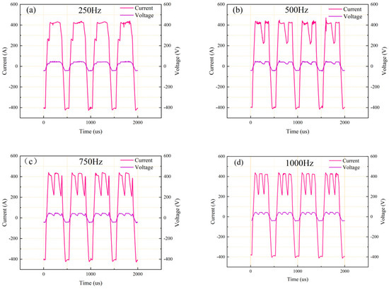 When the intermediate frequency is set at 250 Hz during a variable-polarity phase, the pulse current transitions from 258 A to 430 A and then back to 258 A. As the frequency increases, both the number of intermediate-frequency current pulses and the current shifts from the base peak increase. During welding, the heat generated is directly proportional to the current’s effective value. A higher effective current value results in greater heat input. Figure 6a–d illustrates that, as the intermediate frequency increases, the number of current rising and falling edges also increases. The current takes time to rise and fall along the edge, which results in a decrease in the effective current value and consequently reduces the heat input.