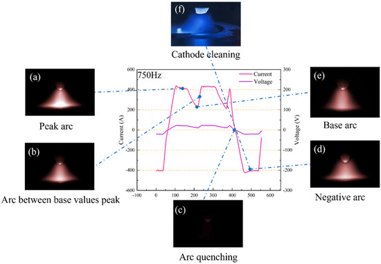 The comprehensive welding electrical signal cycle (5 ms) of the variable-polarity pulse at 750 Hz is depicted in Figure 7a–e, alongside the evolution of the arc profile throughout the variable-polarity pulse cycle. It can be observed from the arc that, during the positive polarity stage, as the current increases, the arc becomes increasingly brighter. When the base peak is reached, the arc profile reaches its maximum, the brightness is at its highest, the arc column area is straight, and the arc assumes a conical shape. As the current decreases from peak to base, the arc darkens, the arc profile continues to shrink, and the arc stiffness diminishes. During the negative polarity stage, attaching the workpiece to the cathode allows high-energy positive ions from the arc plasma to strip away the oxide layer on the surface of the aluminum alloy, while the voltage drop at the cathode enhances oxide layer removal [22]. The arc edge region in the image in Figure 7f shows the presence of cathode spots. Once the oxide layer beneath the cathode spot is removed, the cathode spot naturally moves to the next oxide layer near the weld. Consequently, the mid-arc profile slightly enlarges during the negative polarity process and takes on a bell-shaped form.