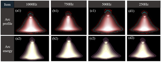 By contrast, the intermediate frequency of 750 Hz was the optimal frequency, resulting in the lowest contraction of arc contours in the peak value, the maximum base value of the arc profile, and the highest value in the core energy region.
