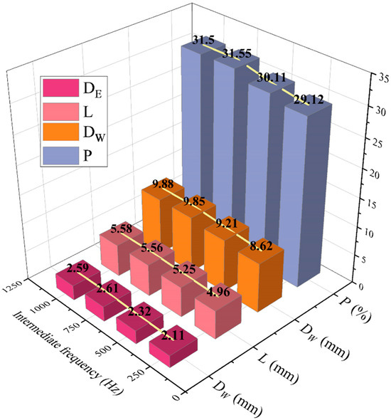 By processing data in batches to calculate average values, the arc images at various intermediate pulse frequency peak stages and their corresponding arc sizes are shown in Figure 10 and Figure 11. The most significant change occurs in the size of DW, which initially decreases steadily and then increases slightly as the intermediate pulse frequency increases. Increasing the intermediate pulse frequency from 250 Hz to 750 Hz results in a higher drop rate of DW, causing its size to decrease rapidly from 14.77 mm to 11.06 mm. As the intermediate pulse frequency increases, the diameter of DW slightly augments and settles at around 11.25 mm when reaching 1000 Hz. The extreme arc size DE exhibits a trend comparable to that of DW, but the impact of intermediate pulse frequency change is significantly smaller due to the restrictions of the tungsten electrode. Increasing the intermediate pulse frequency from 250 Hz to 750 Hz leads to a drop in DE from 2.66 mm to 2.32 mm. As the intermediate pulse frequency increases, the diameter of DE slightly augments and settles at around 2.35 mm when reaching 1000 Hz. An increase in the intermediate pulse frequency results in a longer arc length (L). Increasing the intermediate pulse frequency from 250 Hz to 750 Hz leads to an increase in L from 5.46 mm to 5.82 mm. As the intermediate pulse frequency continues to rise, L eventually decreases to 5.77 mm. The energy distribution coefficient indicates that the arc energy density in the core region initially rises and then falls as the intermediate pulse frequency increases. The arc profile experiences a significant reduction followed by stabilization as the intermediate pulse frequency increases during the peak period of the arc. Once the arc reaches 750 Hz, the size of the arc contracts to its smallest size under four parameters. The arc shows a slight size increase beyond 750 Hz, with a simultaneous decrease in the central energy area. However, the core area of the arc expands at 750 Hz, while the overall size of the arc diminishes.