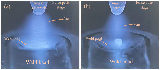 Morphology images of arc and weld pool (a) at peak stage (b) at base stage.