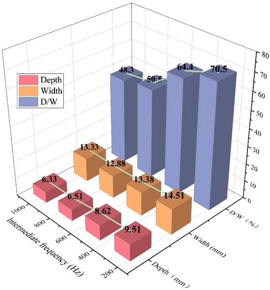 Weld depth, width, and depth–width ratio at different intermediate frequencies.