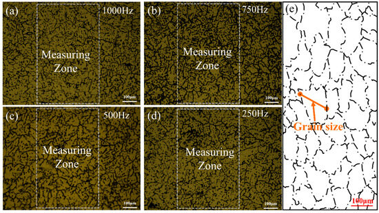 Weld microstructure and grain size at different intermediate frequencies. (a) 1000 Hz (b)750 Hz (c) 500 Hz Weld (d) 250 Hz Weld microstructure (e) Grain Measurement.
