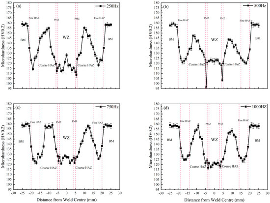 Microhardness of welding joints at different intermediate frequencies. (a) 250Hz (b) 500 Hz (c) 750 Hz (d) 1000 Hz.