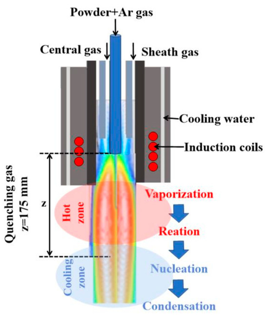 Nanoparticle synthesis is broadly classified into solid-, liquid-, and vapor-based processes, depending on the primary phase responsible for nanoparticle generation [1,2]. Among these, RF thermal plasma synthesis falls under the vapor-based process [3]. The use of electrodeless thermal plasma, generated through inductively coupled radio frequency (RF) thermal plasma, helps to prevent contamination [4,5]. In this method, the extended residence time of particles in flight allows for enhanced energy transfer from the thermal plasma due to the reduced momentum of the plasma itself [6,7]. Axial feedstock injection ensures that particles in flight follow similar trajectories, thereby improving the uniformity of the reaction. Furthermore, the introduction of quenching gas into the vapor phase creates a sharp temperature gradient, which is advantageous for the condensation of vapor species, thus facilitating effective nanoparticle formation.