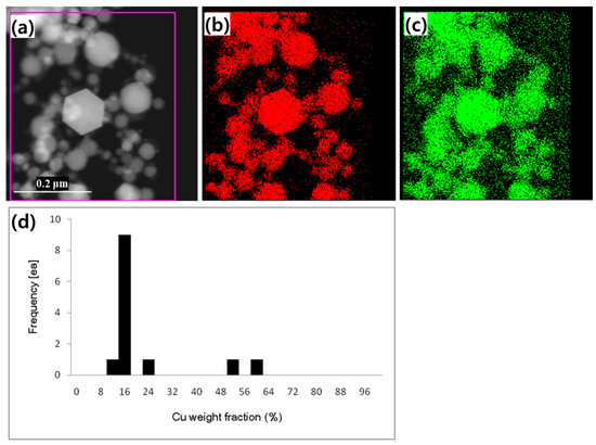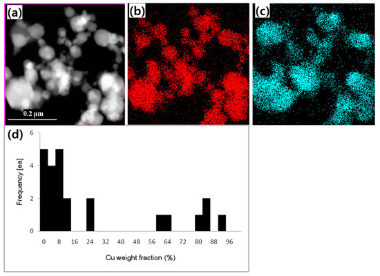 Synthesized nanoparticles were obtained, and the overall chemical composition of particles was measured by elemental mapping using energy dispersive spectroscopy (EDS) via an FEI Quanta 200F field-emission scanning electron microscope (FE-SEM) (FEI company, Hillsboro, OR, USA) after the reactive RF thermal plasma process. The overall Cu weight fraction was measured as 18 wt.% and showed good consistency with theoretically calculated values in the blended feedstock. The phase composition was analyzed using a Bruker D8 Discover X-ray diffractometer (XRD) (Bruker Corporation, Billerica, MA, USA).