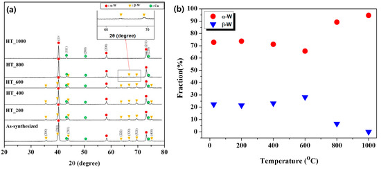 (a) X-ray diffraction pattern showing phase evolution and (b) phase fractions of α-W and β-W with respect to the heat treatment temperature in W/Cu composite nanoparticles synthesized via the RF thermal plasma process.
