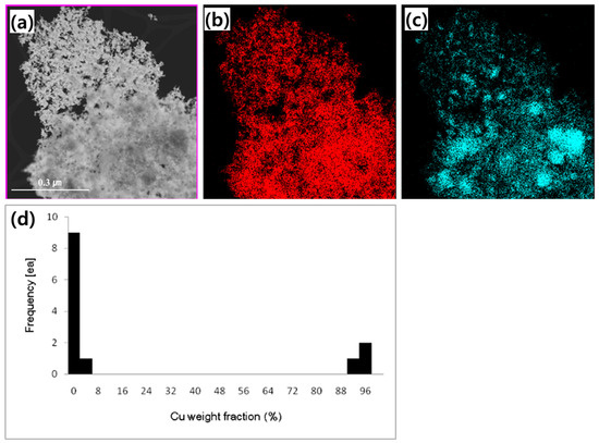 Morphological changes were examined after heat treatment of the as-synthesized Cu-coated W composite nanoparticles. Figure 4 shows the morphologies of the W/Cu composite nanoparticles heat-treated at 800 °C. Significant changes in both morphology and Cu distribution were observed only after heat treatment at 800 °C. On a macroscopic level, the particles treated at 800 °C retain a morphology similar to that of the as-synthesized particles. However, the distribution of Cu and W becomes more distinct, as seen in the elemental maps for W and Cu. Unlike the as-synthesized particles, Cu-rich particles can be separated from W-rich ones, as further confirmed by elemental quantification at the particle level (Figure 4d). The observed morphology and distribution of Cu indicate that localized Cu particulates form due to the short-distance diffusion and coalescence of Cu on the W surface. These Cu segregates typically manifest as particulate Cu or faceted Cu. Faceted Cu is characterized by its ability to bridge W particles with its faceted surface. At 800 °C, it is more common to see localized clusters where W particles are attached to particulate Cu. Notably, W particles are often isolated from each other by intermediate Cu segregates.