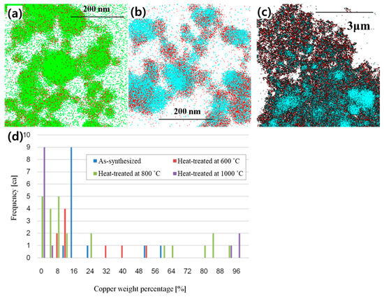 Elemental maps showing Cu distribution in (a) as-synthesized nanoparticles, (b) heat-treated nanoparticles at 800 °C, (c) heat-treated nanoparticles at 1000 °C, and (d) a histogram of the Cu weight fraction in W/Cu composite nanoparticles with respect to the heat treatment temperature. Red dots represent W and other colors represent Cu in elemental maps.