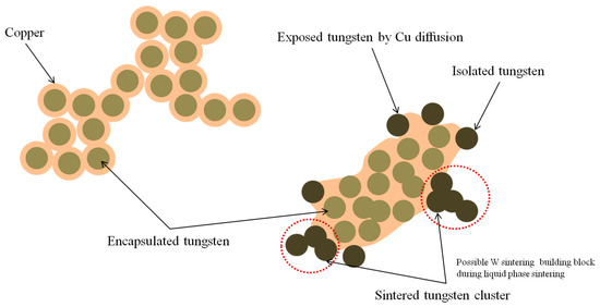 The synthesis and sintering mechanisms of Cu-coated W composite nanoparticles are schematically summarized in Figure 9. Cu-coated W composite nanoparticles are synthesized via reactive RF thermal plasma process. As the heat treatment temperature increases within the solid state, the degree of Cu diffusion and redistribution intensifies. Due to the temperature-dependent diffusivity of Cu, severe segregation occurs through localized Cu redistribution. This redistribution also alters the contiguity of W particles. As the heat treatment temperature rises, W contiguity increases, leading to enhanced sintering between contacting W nanoparticles. The resulting sintered W clusters can serve as building blocks for subsequent liquid phase sintering. The sintering of the W clusters progresses before Cu migrates back toward the network of sintered W clusters. Therefore, the solid-state morphological changes driven by Cu redistribution are considered critical steps in determining the microstructure of W/Cu composite materials.
