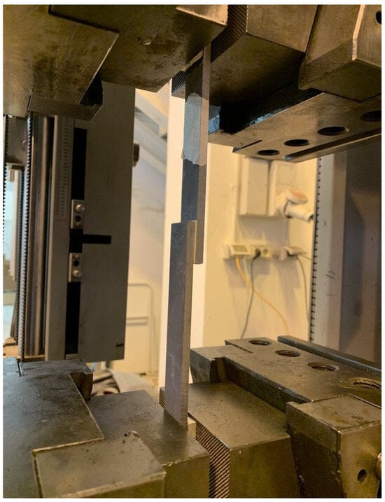 A Zwick-Roell 600 Universal Testing Machine equipped with a 10 kN load cell and tension clamps was employed (see Figure 3) (ZwickRoell S.r.l., Genova, Italy). For each condition (i.e., “Clean”, “Primer”, and “Promoter”), five samples were made.