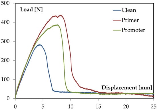 The “Primer” condition exhibits the highest average maximum load, around 550–600 N, indicating superior adhesion strength. The “Promoter” condition shows a lower average maximum load, approximately 400–450 N, but still significantly higher than the “Clean” condition. The “Clean” condition has the lowest average maximum load, around 300 N, confirming that the absence of additional chemical treatments results in weaker adhesion.