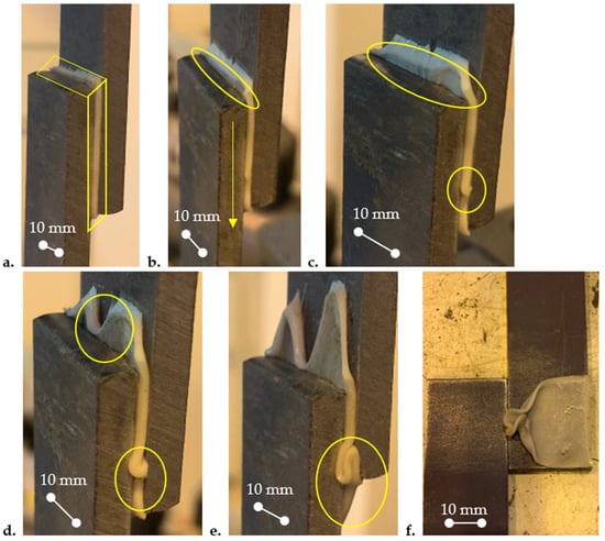Failure modes during the test of a “Clean” sample: (a) Elastic deformation of the tape for all the samples; (b) Debonding between the left sheet and the tape; (c) Progressive debonding and localized deformation into the tape; (d,e) Debonding of other side and increasing localized deformation; (f) Sample after the test.