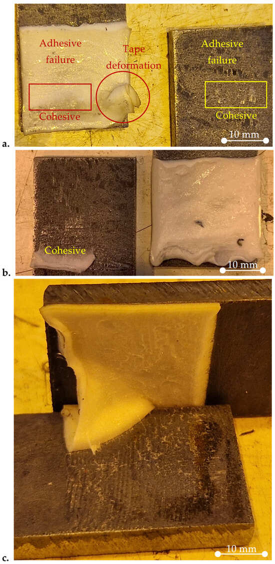 This failure mode results typically for the “Clean” samples, as can also be observed in Figure 6a. The sample exhibits the failure of the adhesive and a localized deformation of the tape. In a small area, part of the tape breaks off cohesively and bonds to the steel substrate.