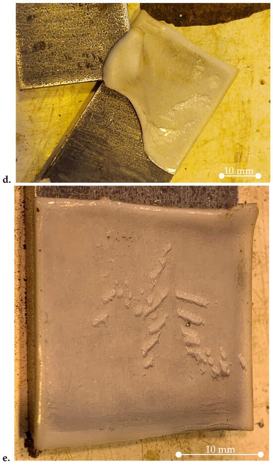 - Figure 5d,e: As debonding becomes more prominent on one side, it triggers similar effects on the opposite side. The adhesive continues to deform, especially in areas where debonding has not yet occurred. This non-uniform debonding and sustained localized deformation correlates with the residual strength of the adhesive tape and prevents immediate damage to the joint.