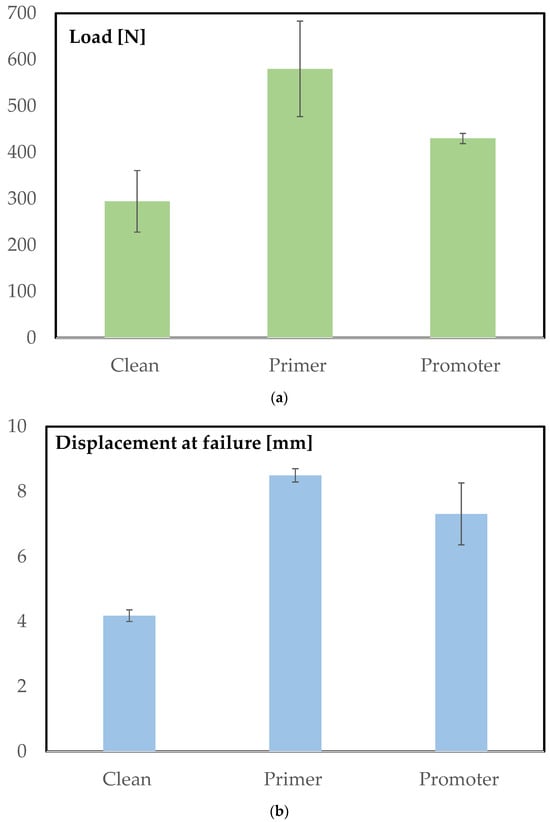 The bars in Figure 7a present the average maximum load for each surface treatment condition: “Clean”, “Primer”, and “Promoter”, along with error bars representing the variability within each set of samples. This visualization provides a clear comparison of the adhesive performance between the different treatments.