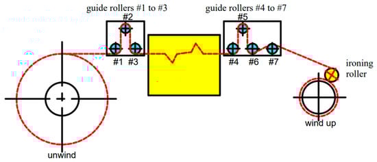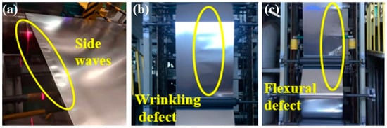 Aluminum foils are widely used in various industries, such as electronics, packaging, spacecraft protections, etc. []. From a manufacturing point of view, aluminum foil is defined as an aluminum sheet with a thickness of less than 200 μm []. 4N6 is an industrially pure aluminum with good elongation and tensile strength, as well as good malleability, corrosion resistance, and electrical and thermal conductivity. These properties make it suitable for producing aluminum foils []. The shape of the board is a crucial factor for assessing the quality of products. It directly impacts the yield of aluminum foil and the overall quality of products with aluminum foil as the main material. Rolling oil and aluminum chips adhering to the surface of the foil after rolling should be cleaned in the cleaning line. It is highly susceptible to wrinkle defects during the winding process on the right side of the cleaning line. Severe wrinkles can cause the aluminum foil to buckle. This results in degradation of product quality and even generation of scrap. Up to now, little research has been performed in this area.