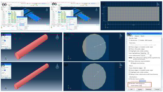 Boundary conditions and geometrical parameters of the simulation: (a) boundary conditions for Stage 1 of the winding process; (b) boundary conditions for Stage 2 of the winding process; (c) sheet length and width dimensions; (d) large roll dimensions; (e) cells contained in large rolls; (f) small roll dimensions; (g) cells contained in small rolls; and (h) thickness setting of the shell cell.
