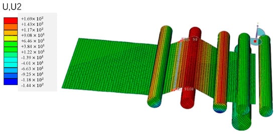 The literature [,,] has studied how the aluminum foil winding process is impacted by the ironing roll’s offset, surface quality, and ironing force FN applied to the aluminum coil. As seen from Table 2, the ironing force FN in the actual cleaning production is 2 N/mm. The friction coefficient of the aluminum foil and ironing roller is 0.6. The offset of the ironing roller is 20 mm. The convexity of the ironing roller is 0 mm.