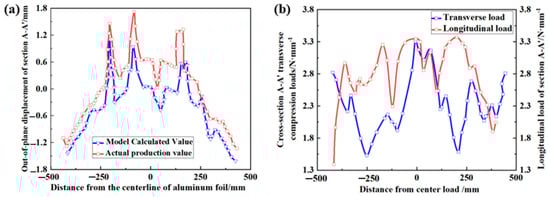 To study the reasons for aluminum foil wrinkling defects during the coiling process, wrinkling of the aluminum foil during the coiling process was simulated. The coil’s convexity is 2.5 mm. The foil’s coefficient of friction is 0.05. The coiling tension is 2.5 N/mm. As shown in Figure 4, the aluminum foil produces wrinkles during the simulation, which coincides with the production of wrinkles in Figure 2a. The longitudinal and transverse loads along the x-direction and the z-direction were extracted from the cross-section A-A, where the aluminum foil is tangent to the aluminum coil in Figure 5a. As seen in Figure 5a, the longitudinal load in the plane of the aluminum foil is unevenly distributed along the transverse direction. The transverse load is dominated by the compressive load. The transverse compressive load can cause the aluminum foil to contract transversely. To verify the accuracy of the finite element model, the machine can be stopped during the production to measure the aluminum foil’s wrinkling at the A-A’ cross-section and its displacement from the surface. The finite element simulation can also be conducted at the same time. The detailed results are shown in Figure 5b. The finite element model has high accuracy in Figure 5b. It can also be used for production condition analysis and simulation. The displacement distribution pattern outside the aluminum foil surface is the same. Therefore, the difference between the calculated values of the model and the measured values of the production is negligible.