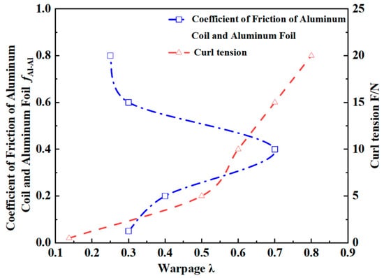 Aluminum coil and aluminum foil friction coefficient, curl tension F, and warpage relationship.