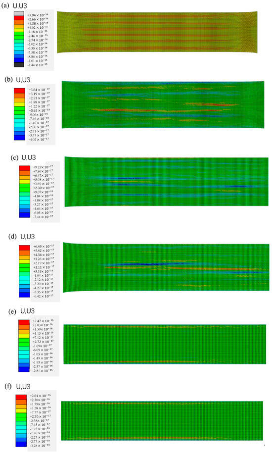 As depicted in Figure 8a, it is evident that at a tension strain of 5 N, the aluminum foil exhibits a relatively low degree of surface wrinkling, with a rather uniform distribution of wrinkles. When the tension force increases, the wrinkles on the surface of the plate become more and more obvious on both sides of the plate, and the degree of the wrinkles becomes bigger and bigger. From Figure 8c–f, further increasing the tension force makes the wrinkling degree in the middle of the plate unevenly distributed. As seen from Figure 8d, it is evident that the aluminum foil exhibits a greater degree of wrinkling on both sides as compared to the central region at a curling tension value of 20 N. Further, the distribution of these wrinkles is very uneven, leading to the formation of defects in the aluminum foil rolled into the aluminum coil. The small tension can control the wrinkling situation. It is better to control the tension between 5 N and 10 N. An increase in winding tension leads to the phenomenon of an increase in the overall stress level of the aluminum foil. Excessive tension can cause the overstretching of the foil, leading to an increased warpage. Therefore, controlling the tension within a moderate range can effectively reduce the wrinkling of the aluminum foil.