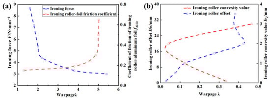 Relationship between ironing roller and warpage: (a) ironing force FN, ironing roller−aluminum foil friction coefficient, and warpage relationship; and (b) ironing roller offset, ironing roller convexity value, and warpage relationship.