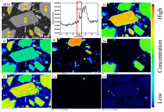The lithium ore was analyzed using EPMA at the point, line, and surface levels, as displayed in Figure 3. Table 2 shows the elemental composition of the marked points in Figure 3 (SEM). Si, Al, and O were evenly distributed on the surface of the sample, the silicon–aluminum ratio of points 1 and 3 was 2:1, and the sodium–potassium contents were low, which can be inferred as spodumene. The proportion of SiO2 in point 2 was 99.88 wt.%, which can be determined as quartz. The silicon–aluminum ratio of points 4 and 5 was about 2.5:1 and contained a small amount of sodium, which was presumed to be albite or mica. The ratio of silicon–aluminum–potassium at point 6 was 2:1:1, which can be inferred as orthoclase. The line analysis revealed a peak of the lithium signal in Figure 3, located at 54 μm. This suggests that the sample does contain lithium, which is consistent with the inference from points 1 and 3 above. In addition, the above analysis results were supported by EDS.