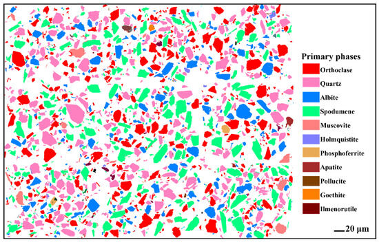 The main minerals in lithium ore are shown in Table 3, along with their respective contents. The results were consistent with XRD, and quartz (28.97 wt.%), orthoclase (22.66 wt.%), albite (14.35 wt.%), and spodumene (29.85 wt.%) were the main minerals. The mineral liberation mapping of lithium ore was depicted in Figure 4, where it was observed that the four phases mentioned above were uniformly distributed, the individual particles were devoid of any mineral impurities, and no clear mineral paragenesis was present. The sample contained less than 0.1 wt.% of goethite, iron phosphataneous ore, amphibole, and other minerals. The mica content was low, which explained why the mica peak in the XRD was weak.