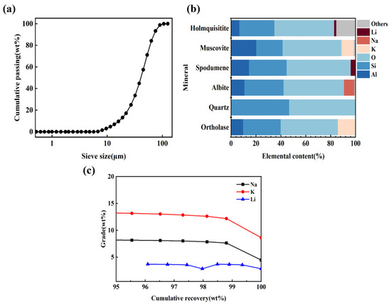 MLA statistical data analysis ((a) the lithium ore particle diameter; (b) the elemental content of major mineral phases; (c) theoretical grade recovery curves of Li, Na, and K).