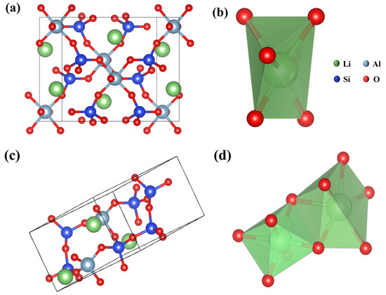 The crystal structure microscopic model of α–LiAlSi2O6 and β–LiAlSi2O6. (a) the crystal structure microscopic model of α–LiAlSi2O6; (b) the unit cell structure model of α–LiAlSi2O6; (c) the crystal structure microscopic model of β–LiAlSi2O6; (d) the unit cell structure model of β–LiAlSi2O6.