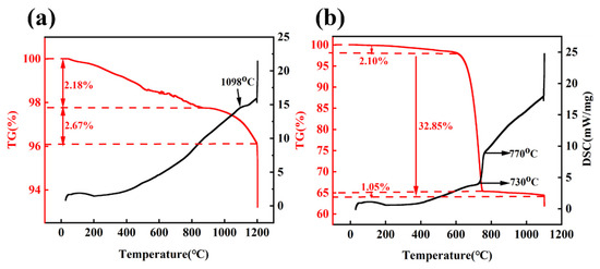 TG and DSC curves ((a) TG and DSC curves of lithium ore; (b) TG and DSC curves of lithium ore mixed CaCO3).