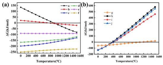 Thermodynamic calculation of possible reactions in Table 6 ((a) reactions in the sintering process; (b) reactions in the leaching process).