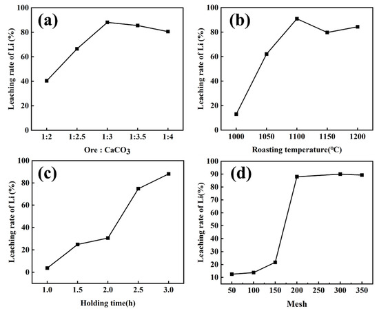 Effects of various variables on the leaching rate of Li ((a) ratio of ore and limestone; (b) temperature; (c) holding time; (d) particle size).