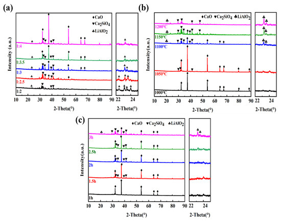 When the condition that the ingredient ratio was 1:3 and the sintering time was 3 h, the effect of sintering temperature on the leaching rate of lithium was investigated in Figure 9b, and the XRD patterns of sintered products were shown in Figure 10b. The leaching rate rose dramatically from 13.07% to 88.09% with the sintering temperature increase of 1000 to 1100 °C, while the leaching rate decreased at 1200 °C. Combined with Figure 10b, it can be seen that the diffraction peak of LiAlO2 was not detected at 1000 and 1050 °C, which may be due to the incomplete transformation of α–spodumene. Its octahedral structure was difficult to destroy and Li+ cannot be released. From 1100 to 1200 °C, the peak value of LiAlO2 increased gradually, and the peak value of CaO decreased gradually. At 1200 °C, the peak of LiAlO2 was the most significant, and CaO reacted with LiAlSi2O6 to its fullest extent. However, the amount of Ca(OH)2 that must be produced during the leaching process was insufficient because of the material’s reduction in CaO. The leaching rate decreased at 1200 °C due to over-burning during the sintering process, high material hardness, and insufficient grinding and crushing.