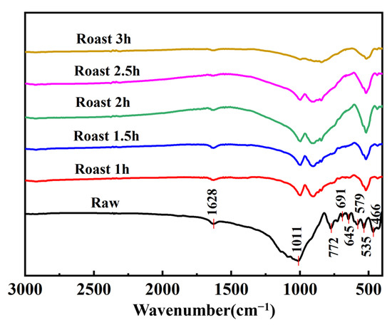 The FTIR spectra of the raw material and the addition of CaO for 1–3 h are shown in Figure 11. The types and peaks of functional groups in the raw materials are shown in Table 7. At the roasting time of 1–3 h, the diffraction peaks of Si–O–Si and Si–O almost disappeared, indicating the cleavage of Si–O–Si and Si–O chemical bonds [34]. The diffraction peaks of Si–O–Al were still observable during roasting 1–3 h, but the intensity of 3 h was slightly weaker than that of 1 h, indicating that the internal structure of spodumene was gradually destroyed.
