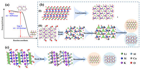 The mechanism of the sintering process ((a) the energy required for the transformation of the crystal form; (b) spodumene sintering process; (c) lepidolite sintering process).