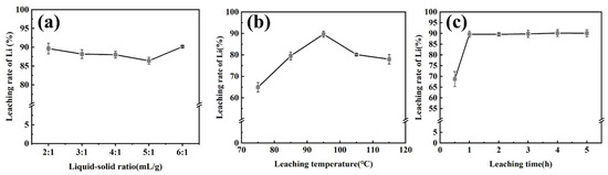 Effects of various variables on the leaching rate of Li. ((a) ratio of liquid and solid; (b) leaching temperature; (c) leaching time).