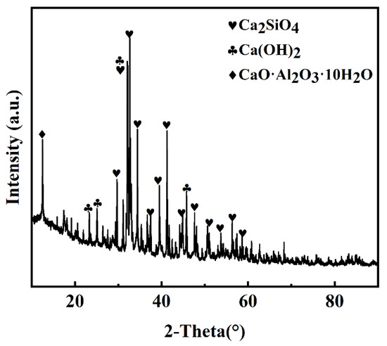 The XRD of the leaching residue under optimal conditions is shown in Figure 14. Analysis of the leaching residue shows the presence of Ca2SiO4, Ca(OH)2, and CaO·Al2O3·10H2O. However, the expected product 3CaO·Al2O3·6H2O was not detected, suggesting an incomplete reaction between Ca(OH)2 and LiAlO2 during the leaching process. The solubility of Ca(OH)2 decreased with increasing temperature. In the experiment, we adopted the method of hot filtering, and the unreacted Ca(OH)2 was left in the form of precipitation in the filter residue.