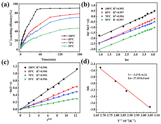 In general, reactions between solid and liquid involve the transfer of various substances between the two phases, mainly including mass transfer in the liquid boundary layer (Equation (2)), chemical reactions on the surface (Equation (3)), and diffusion in the solid surface layer (Equation (4)) [38,39,40]. Usually, for a kinetic study, the solid material is spherical, and the particle size distribution needs to be narrow. However, after sintering and grinding, the particles were finer and could not achieve a narrow particle size distribution. Moreover, there were many impurities in the raw materials, and the reactions during the leaching process were complex, resulting in the low correlation coefficients for these models. As a result, Sharp’s method (Equation (5)) was set as the fitting model [41,42]. According to Figure 15a, the leaching rates of Li+ were investigated at various reaction temperatures (55–100 °C) and leaching times (1–180 min) under the conditions of liquid/solid (L/S) = 2:1 and a stirring speed of 400 r/min. It can be seen that the leaching reaction was concentrated within 60 min, indicating that this stage was the key for kinetic analysis.
