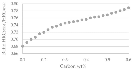 The dataset also contains information on the percentage of mass concentration of the seven alloying elements, namely C, Mn, Si, Cr, Ni, Mo and Cu. The complete homogeneity of the steel is not realistic to expect. A small deviation in homogeneity can significantly affect the microstructure distribution along the Jominy specimen. The presence of martensite was considered. The limit is set at 50% of martensite in the structure. The ratio of hardness of steel with 50% martensite in the microstructure and 99% of martensite in the microstructure for different carbon content is shown in Figure 1 [].