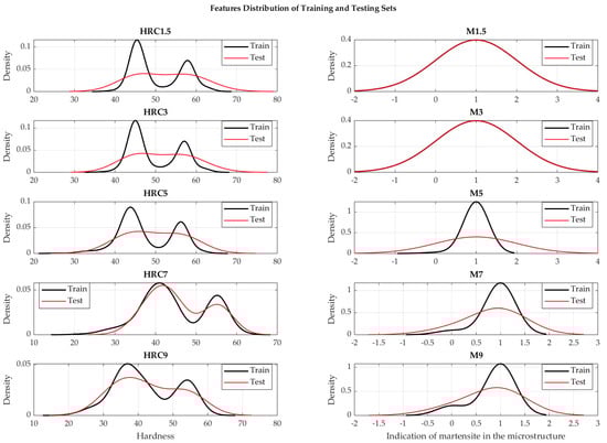The Kolmogorov–Smirnov (KS) tests were carried out for each feature at a 5% significance level to assess the similarity of feature distributions between the training and test datasets. The KS test values were calculated for the features of hardness (HRC) and microstructure at specific distances from the quenched end of Jominy specimen. The obtained KS test values are between 0.09 and 0.167 for hardness and between 0 and 0.161 for microstructure. In addition, the p-values were calculated for each test, ranging from 0.57 to 0.99 (hardness) and 0.96 to 1 (microstructure), indicating no substantial evidence to reject the null hypothesis of similarity between the distributions. These results suggest that the model is likely to generalize well with the unseen test dataset (Figure 3).